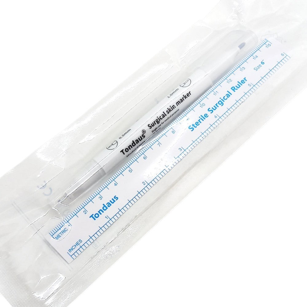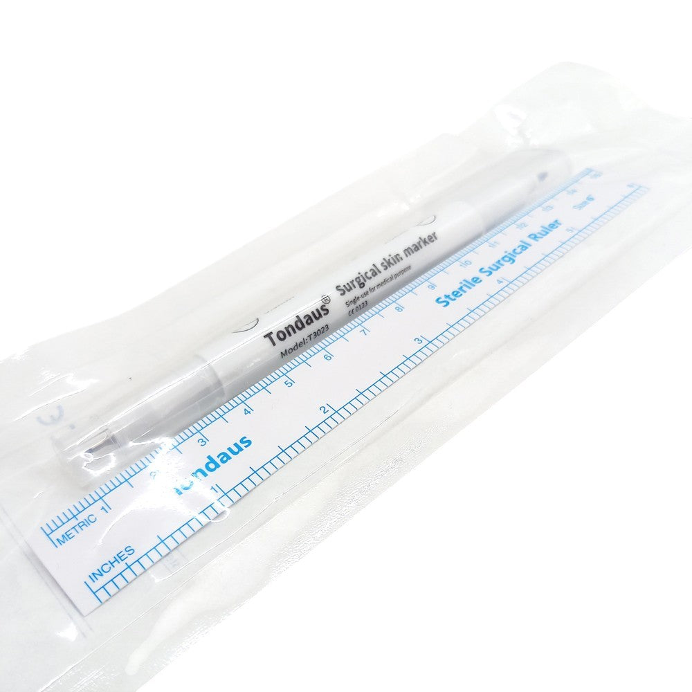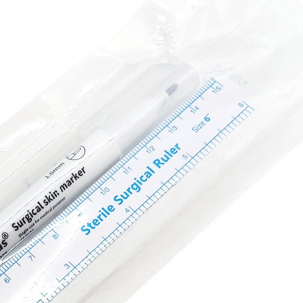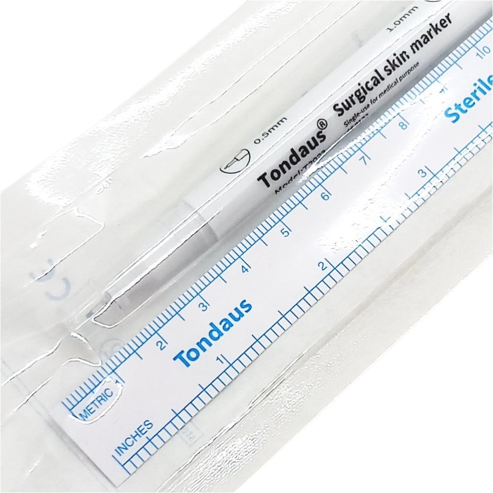 The blackPMUmarker and ruler are packaged in sterile packaging. The marker is double-sided, with a small, fine tip on one end and a thicker tip on the other. This is a handy tool for sketching out Microblading and permanent makeup eyebrows.