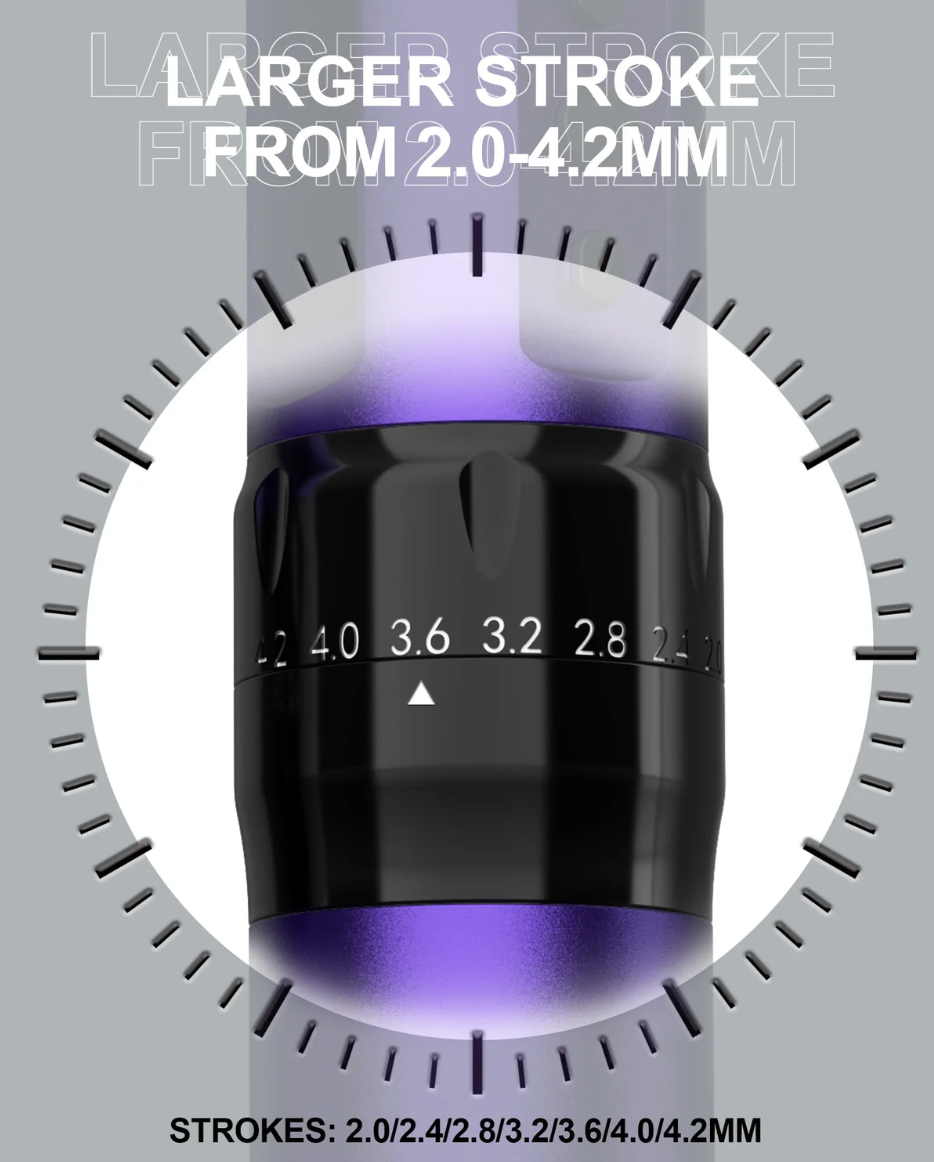 La macchina ha la corsa intercambiabile. Ciò significa che è possibile utilizzare la macchina con più lunghezze di corsa semplicemente ruotando il centro. È possibile configurare questa macchina da Lunghezza corsa da 2,0 mm a 4,2 mm. Ciò rende la macchina adatta per trattamenti PMU come eyeliner ai tatuaggi, all'SMP e ai trattamenti mimetici sulle pelli più rigide.